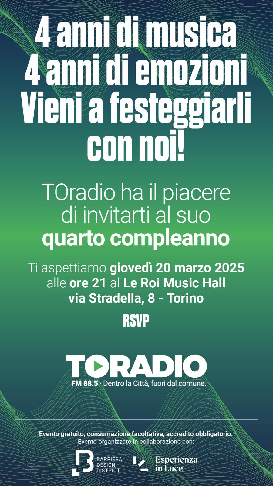 TOradio compie 4 anni e festeggia con te! 4 anni di musica, 4 anni di emozioni, vieni a festeggiarli con noi! Ti aspettiamo giovedì 20 marzo alle ore 21 a Le Roi Music Hall in via Stradella 8 a Torino. Evento gratuito, consumazione facoltativa con accredito obbligatorio. TOradio e il suo quarto compleanno. Sei pronto per la festa? Evento in collaborazione con Barriera Design District, Somewhere Tour e Esperienza In Luce.