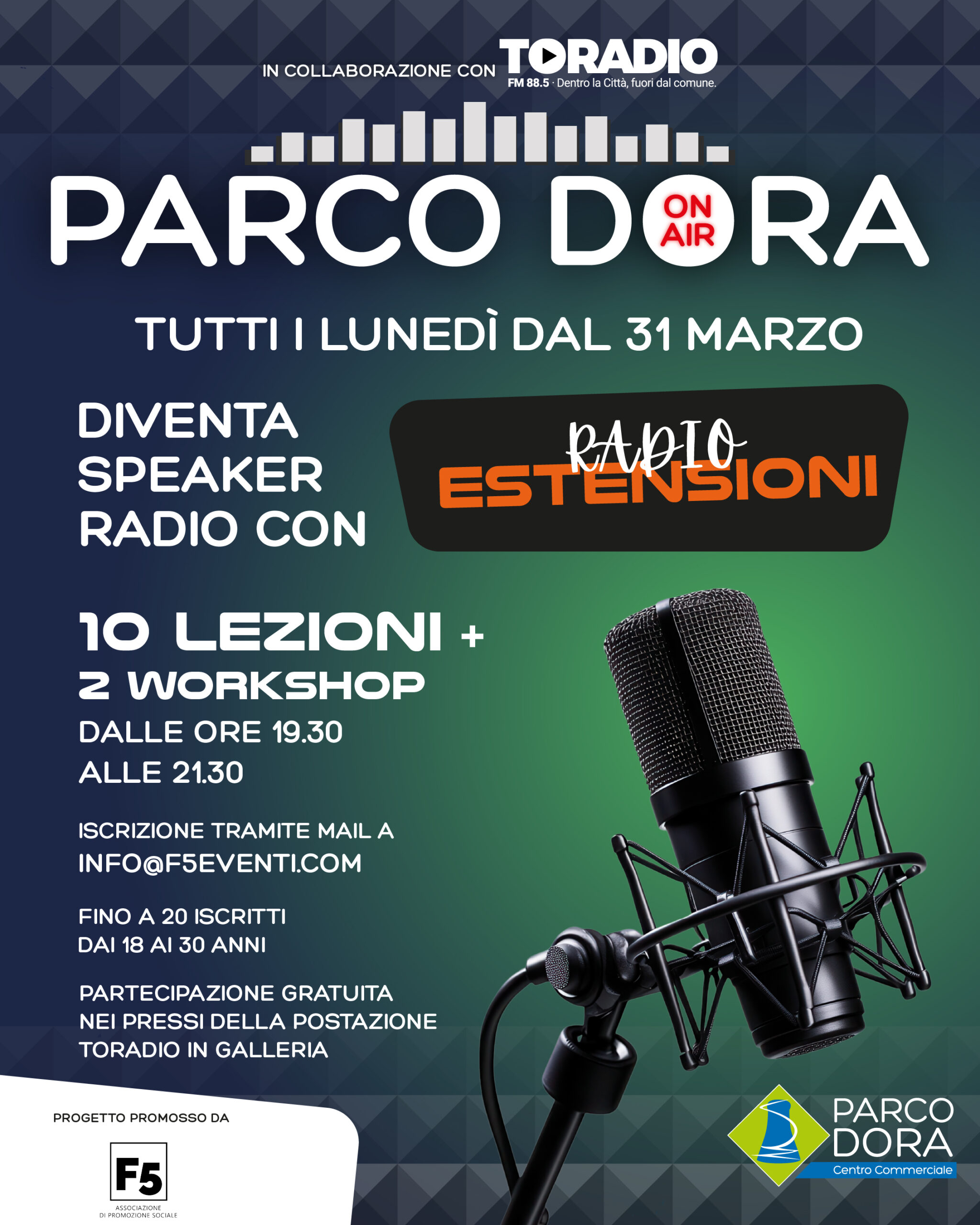 Il corso di formazione radiofonica gratuito e disponibile per gli under30. Per informazioni e iscrizioni, manda un'email a info@F5eventi.com